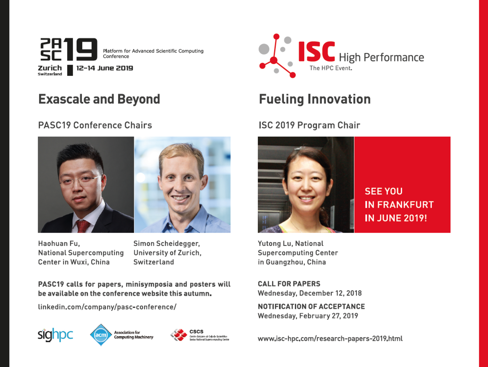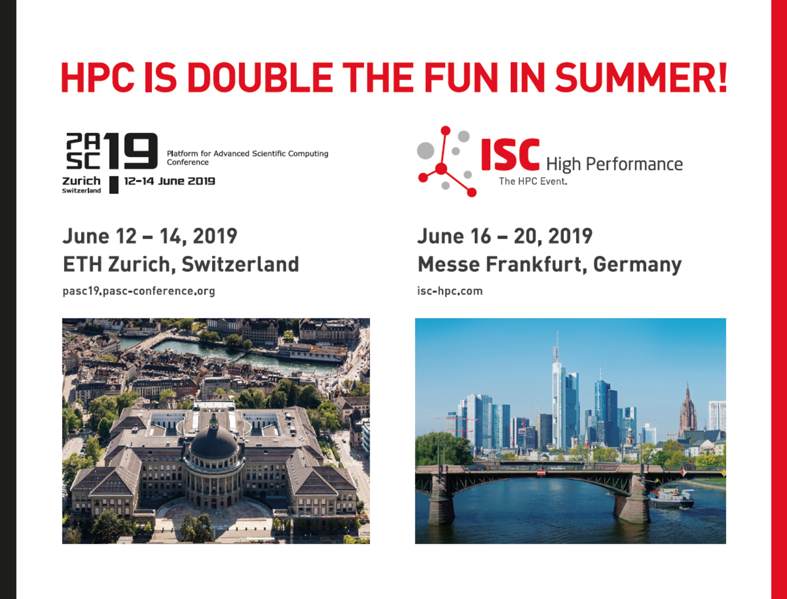 ISC High Performance and the PASC Conference are pleased to announce that ISC 2019 and PASC19, two major events in the European HPC ecosystem, are scheduled back-to-back in June 2019.