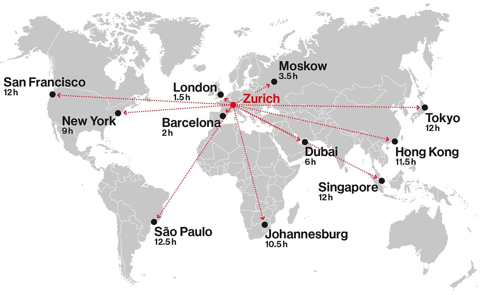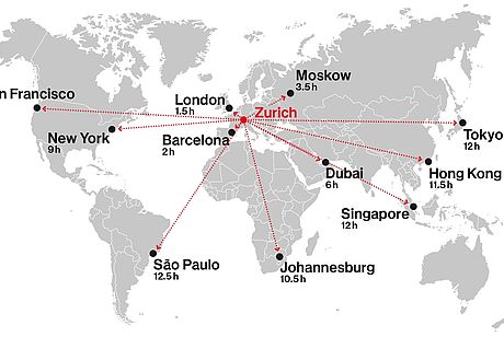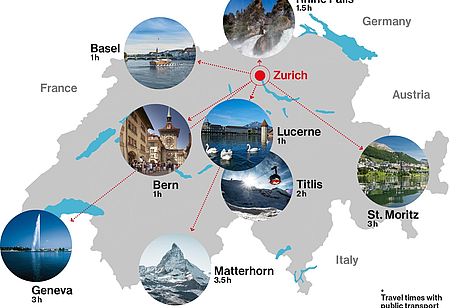 Zurich is located in the center of Switzerland and at the heart of Europe. Whether you are coming from Madrid or Stockholm, most European capitals are reached in less than 2.5 hours from Zurich by plane. With its Main Railway Station, Zurich also has the largest railway station in Switzerland – with direct connections to other Swiss cities and the surrounding countries.